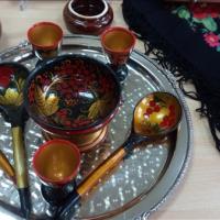 Выставка инсталлирована изделиями из дерева и керамики, драпирована яркими платками в народном стиле.