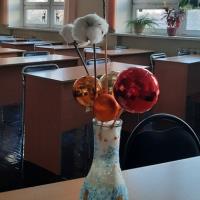 Гирлянды из списанных методичек, елочки из оберточной бумаги из-под цветов, лент от кассовых аппаратов и втулок от штрих-кодов! Декупажные вазы из обороток и салфеток; засушенная виноградная ветвь, осыпанная мелко нарезанной сеткой для фруктов; декорированные белым штрихом сосновые шишки, собранные на заднем дворе университета.